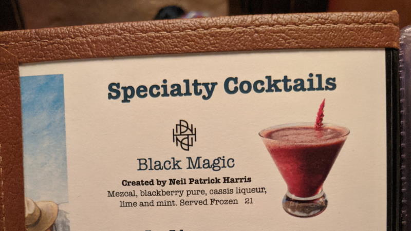 The Black Magic cocktail, created by actor Neil Patrick Harris, debuted in December at La Cava del Tequila in Epcot. NPH is a fan favorite narrator at the Candlelight Processional shows at Epcot during the holidays. His frozen beverage contains Mezcal, blackberry puree, cassis liqueur, lime, and mint. It costs $21.