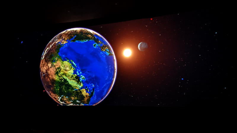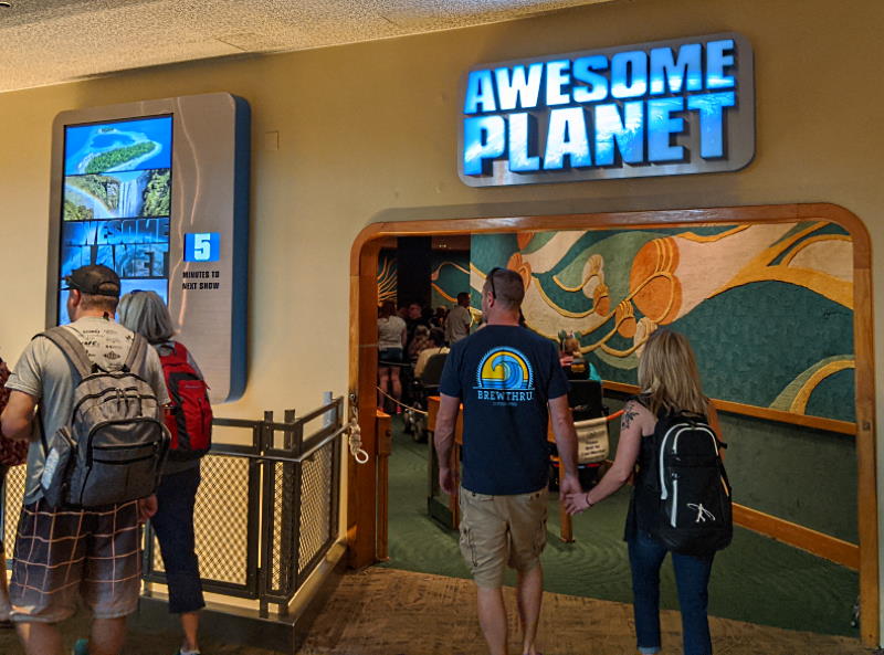 Run time for Awesome Planet is 10 minutes. Theater effects, including light effects and air effects (blowing air and scented air), enhance the experience.