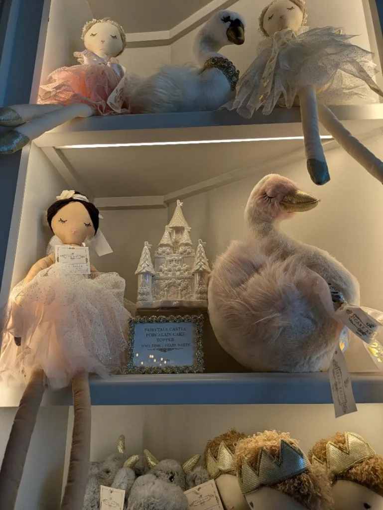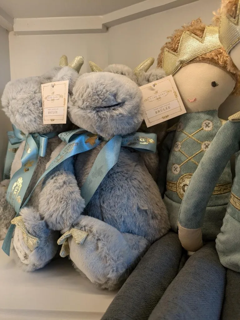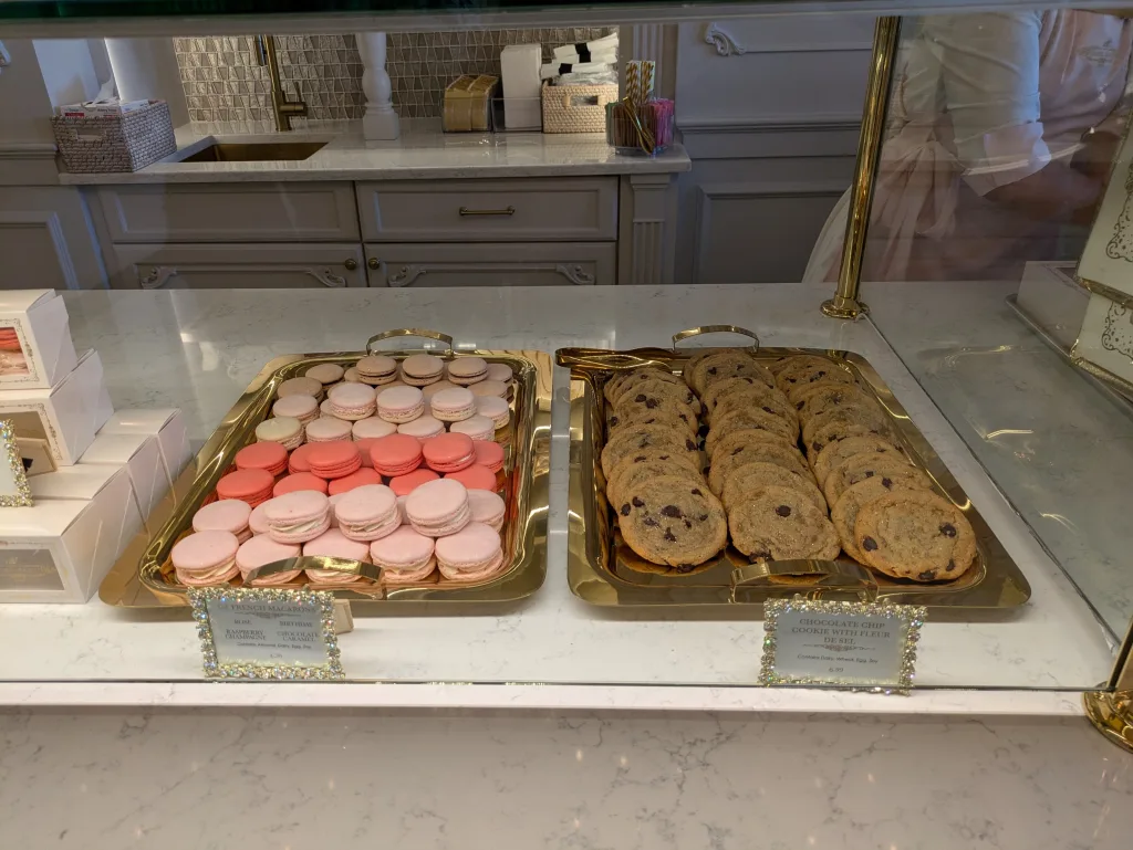 One of the cool things we learned while waiting at the register for our coffees was that Cake Bake has a special lore. We found out about the lore after a cast member noticed us admiring a stuffed dragon in the merch section. He told us the dragon was Cake Bake’s mascot named Brûlée. Legend has it that Brûlée wakes up early every morning, flies around the shop, and lights the chandeliers hanging from the ceiling. He also drops pixie dust everywhere, which can be seen on some of the baked goods, like the chocolate chip cookies. In fact, there's a whole cast of characters, including a swan named Gwendolyn after the founder.