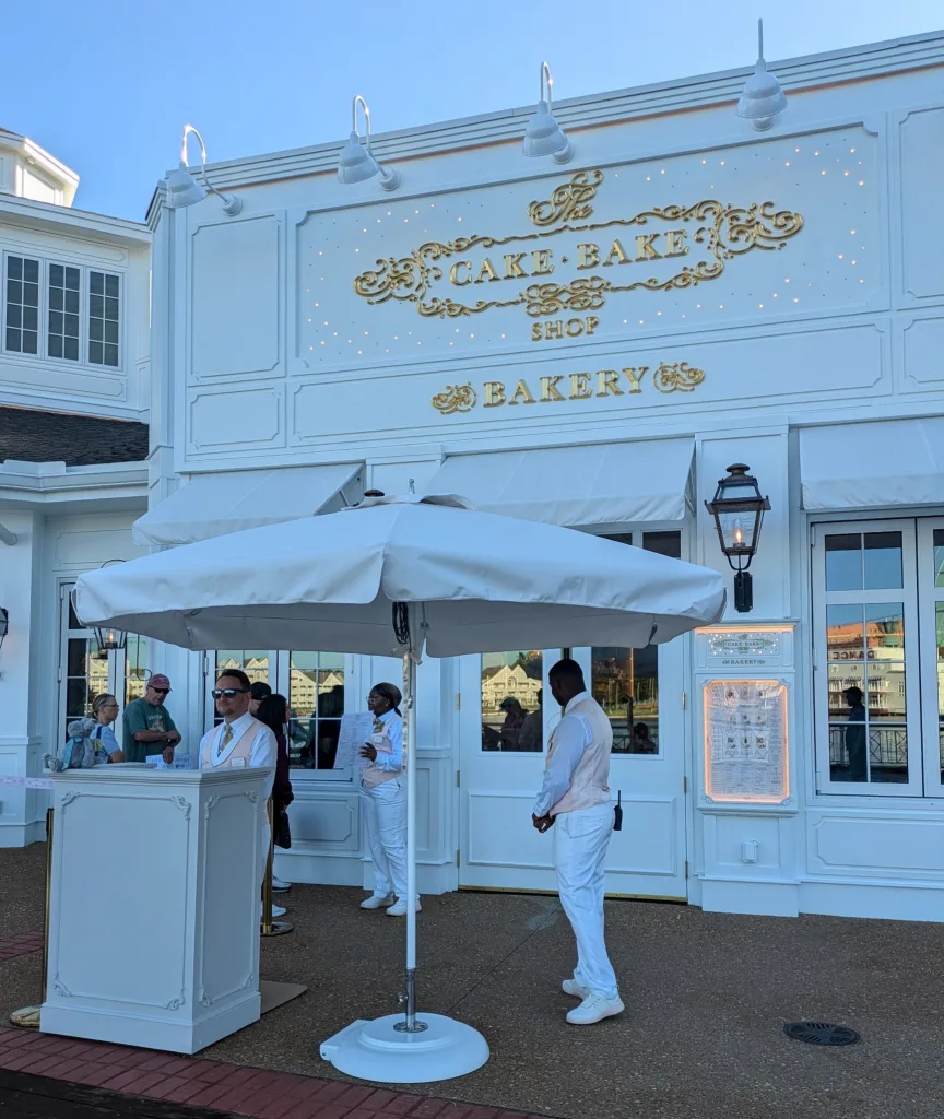 While on our journey, we got a hint that something was up when we saw people carrying these white bags with gold handles. Cake Bake bags? Looking ahead, we could see a few people in front of The Cake Bake Shop at the far end of Disney's Boardwalk. Was it actually open or was it just another media preview? Maybe it was a soft opening? It was!