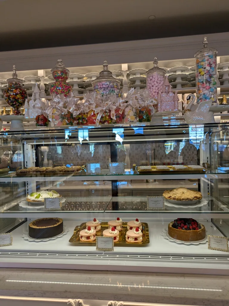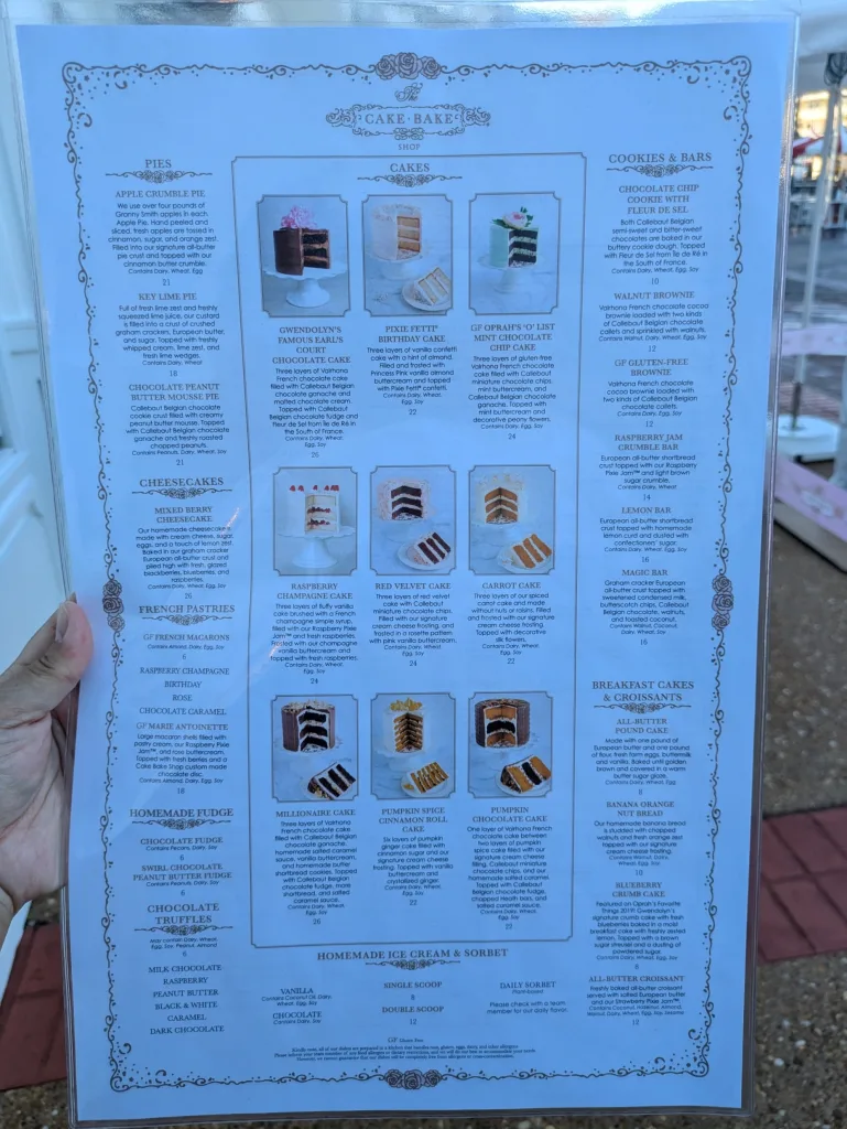 The cast member handed us menus and we got in line for the bakery. The menu was pretty extensive and featured cakes, pies, cookies, pastries, and an assortment of caffeinated and alcoholic beverages. The prices were not for the faint of heart.