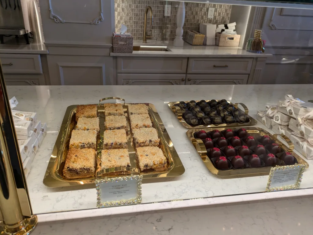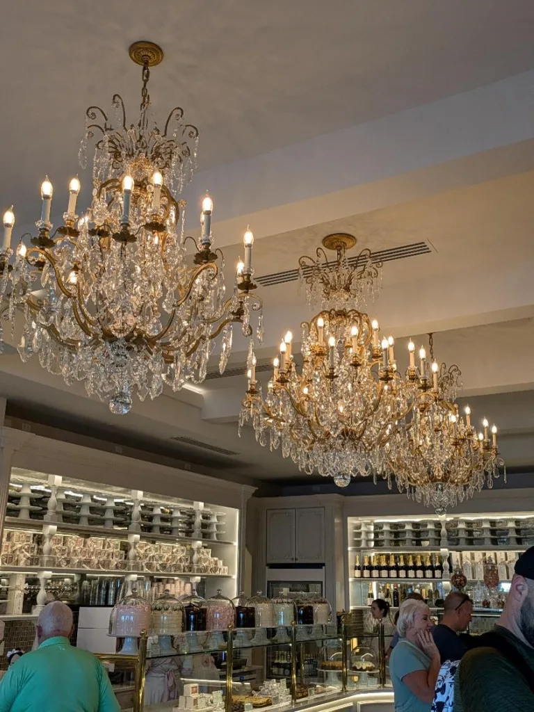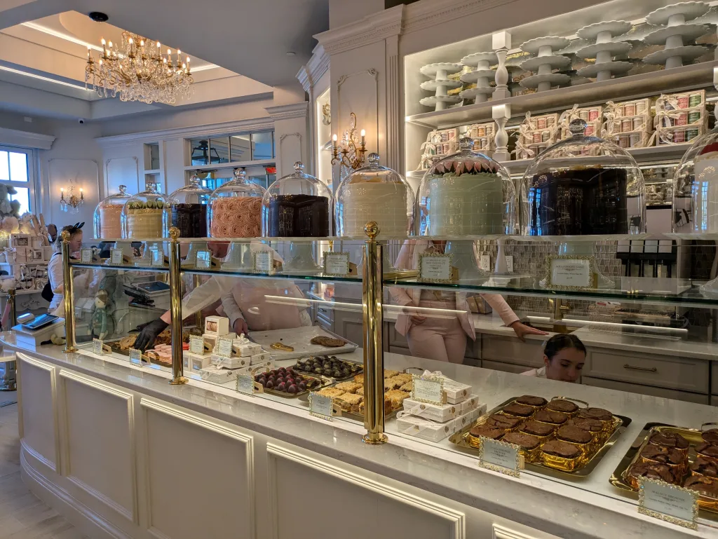 After a short wait, we were let inside. It was quite opulent and the interior was fitting of a luxury bakery. Customers enter down a roped central aisle under golden chandeliers. The aisle splits at the back counter to form a line to the left and one to the right. Customers order at the back counter and then follow the counter back towards the entrance where the registers are. There were a few displays with merch available to purchase near the registers as well.