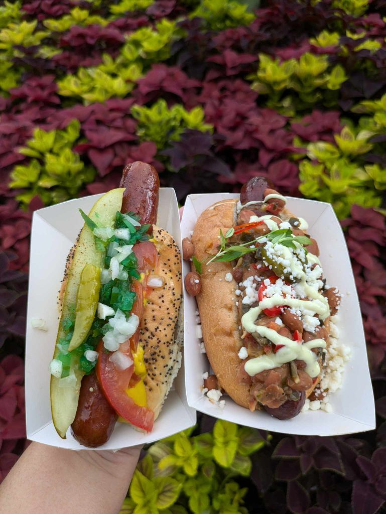 Southwest-Style Dog ($7.25): A bacon-wrapped dog topped with beans, tomatoes, pickled jalapenos, avocado crema, and queso fresco on a roll. They had us at “bacon-wrapped.” Still a solid choice. We can’t wait to try the other offerings at this booth.