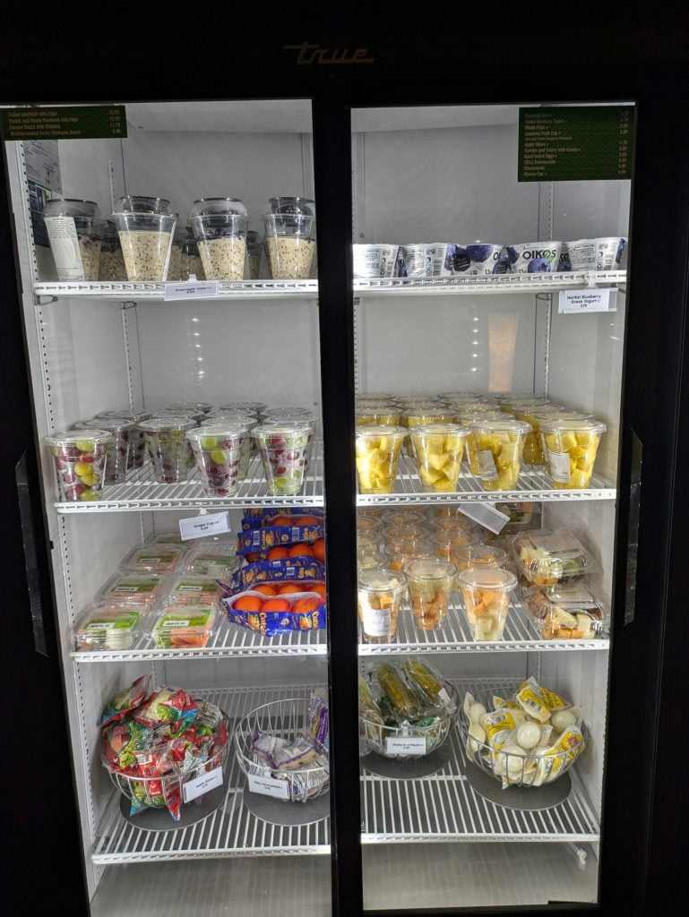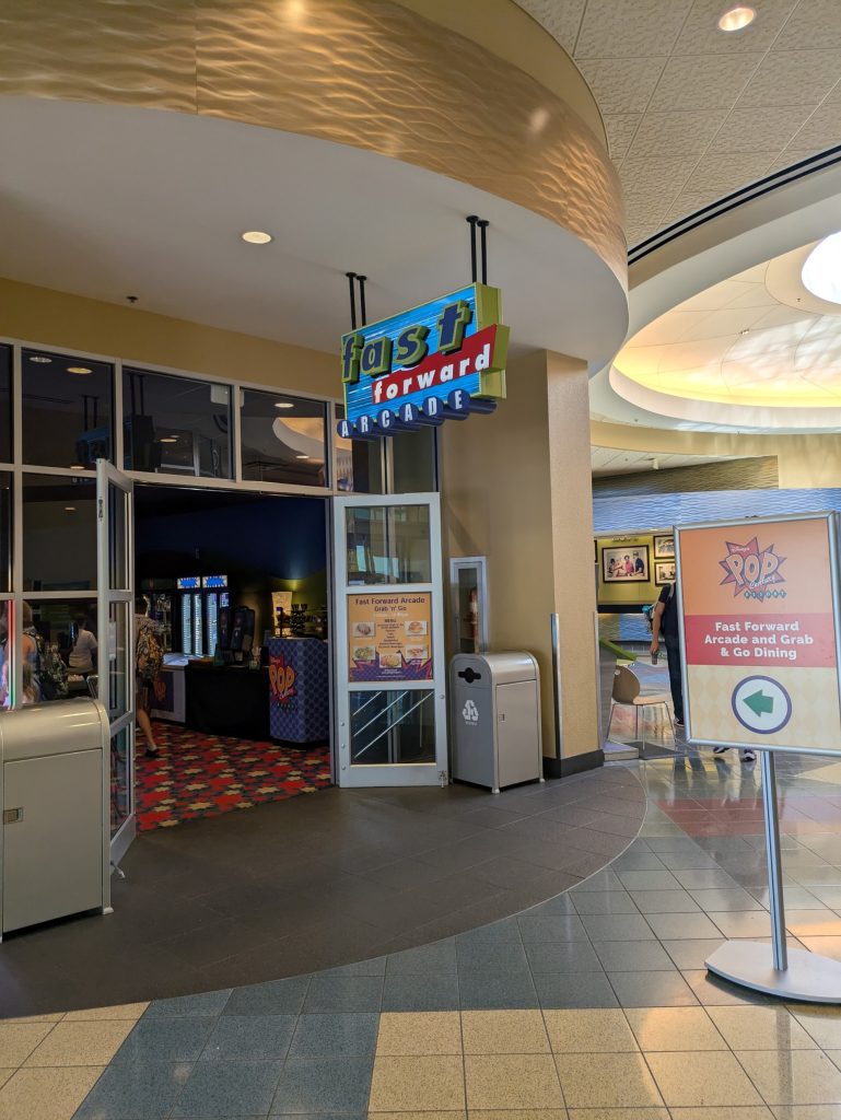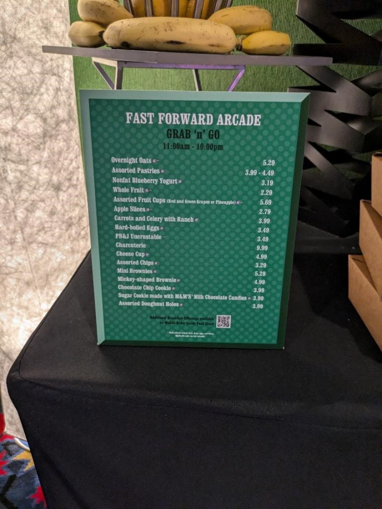 For those on the go, the Fast Forward Arcade offers grab-and-go options from 7:00 AM to 10:00 PM. Here, you can find cold sandwiches, salads, pastries, and bottled drinks. Additionally, hot dogs and pizza are available from 10:00 AM to 4:00 PM, as informed by a friendly cast member.