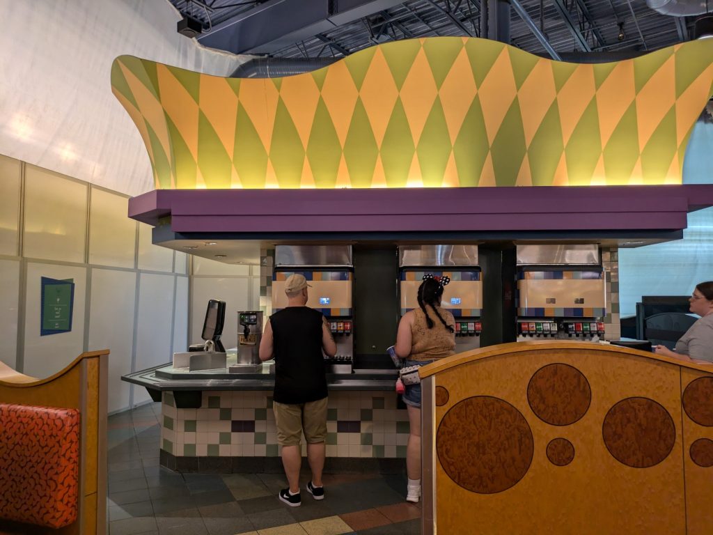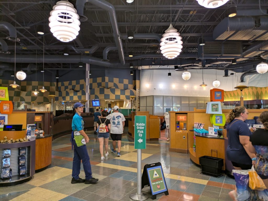 During this period, a modified version of the food court is operational from 7:00 AM to 11:00 PM. While most of the service area is temporarily closed, two seating areas and one bank of soda fountains are still available for use. Guests are encouraged to use mobile ordering, with a large pick-up zone conveniently located in the main seating area.