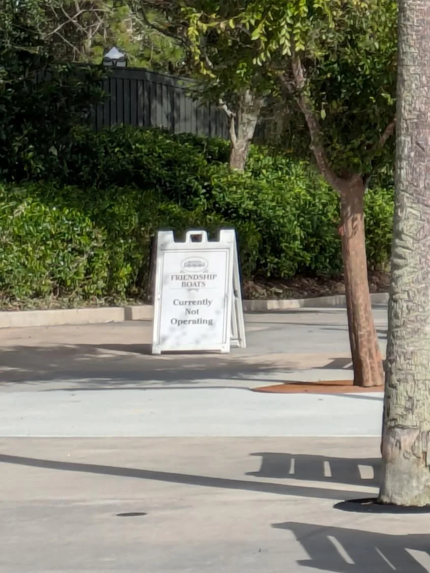 We only spent a few moments pin trading at the front of Hollywood Studios before walking to Epcot using the walkway to Disney’s Boardwalk. It was on this journey that we noticed the Friendship boats from the Epcot area resorts weren’t running. We spoke to a cast member who told us the water was too high, so they weren’t operational. They didn’t know when the service would return. However, the boats were available to take guests to Epcot, except for the boat from the Swan and Dolphin hotel. We later found out this was because the high water reduced clearance under the footbridges near Swan and Dolphin, only permitting travel between Yacht and Beach Club and Boardwalk Inn to Epcot.