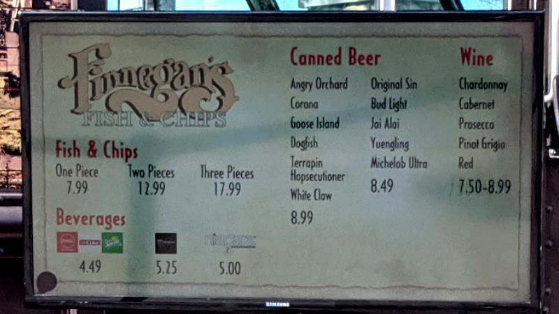 A food truck was seen out at Universal Studios this week. Located across from Mel’s Drive-In, the truck’s menu offered just one food item: Fish & Chips from Finnegan’s Bar and Grill, which is one of the park’s full service eateries located in the New York area of Universal Studios. Soft drinks, beer, and wine were also available.