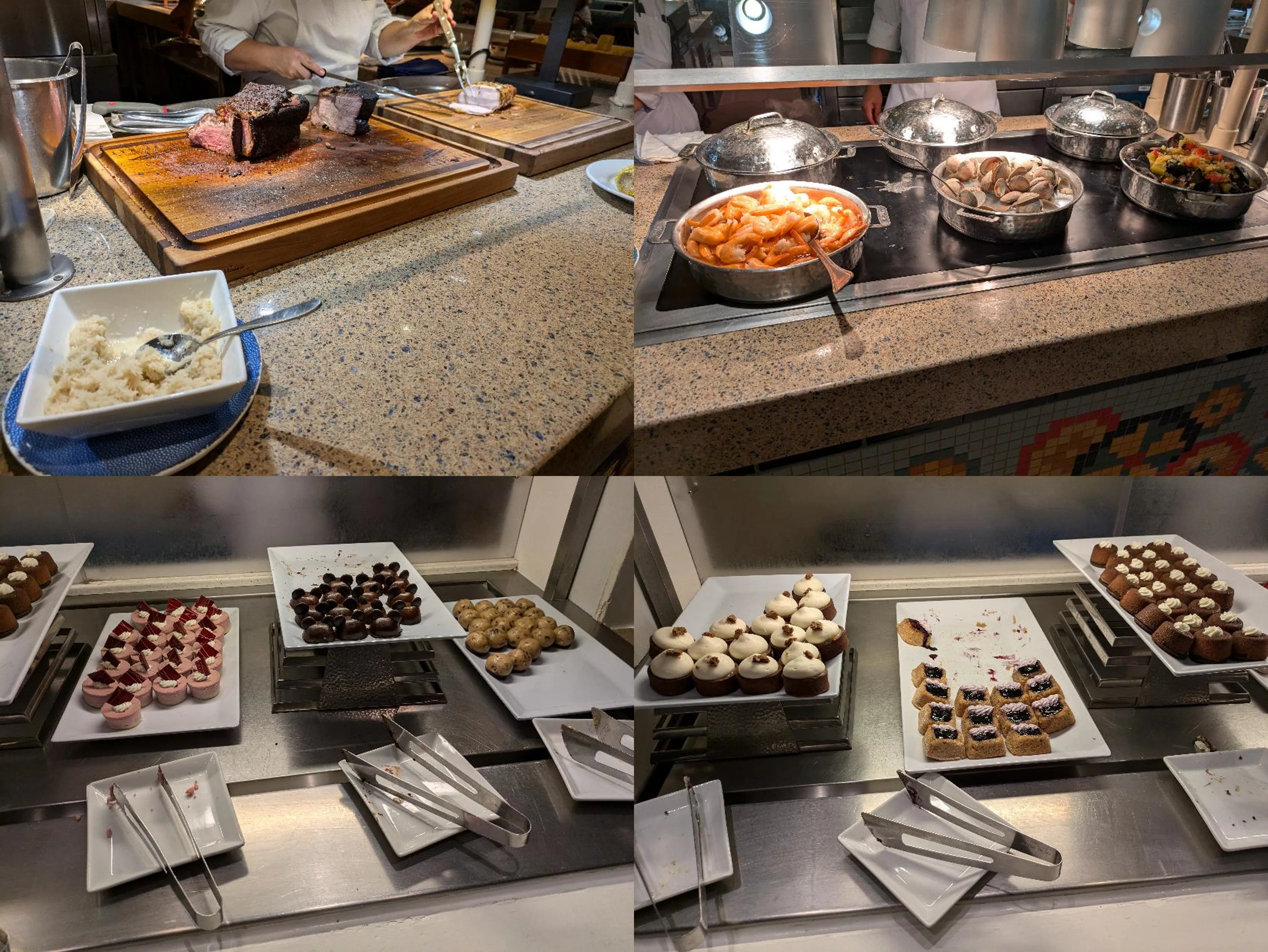 The second hot side included a carving station with beef and pork, with optional horseradish or sour cream onion sauce. Further along was a kids’ food section with pasta with marinara sauce, meatballs, pizza, macaroni and cheese, and baked chicken legs. This was a very popular section for all ages. Not a very adventurous side, but a good selection of meats and comfort foods.